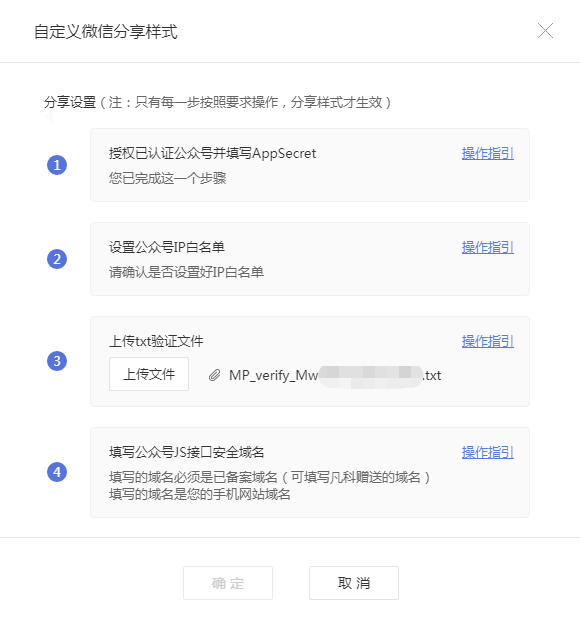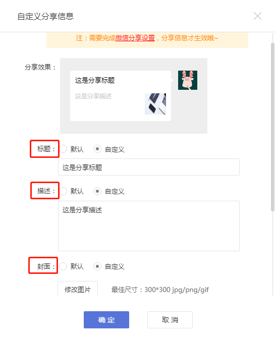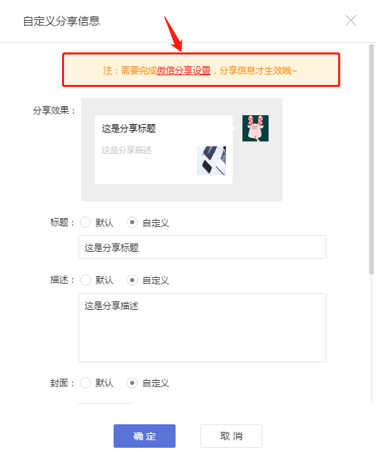 5.2、需要注意的是,要先完成“微信分享设置”,自定义分享信息才生效。“微信分享设置”一共4步,具体设置方法参照上文“步骤4.3~4.6”。