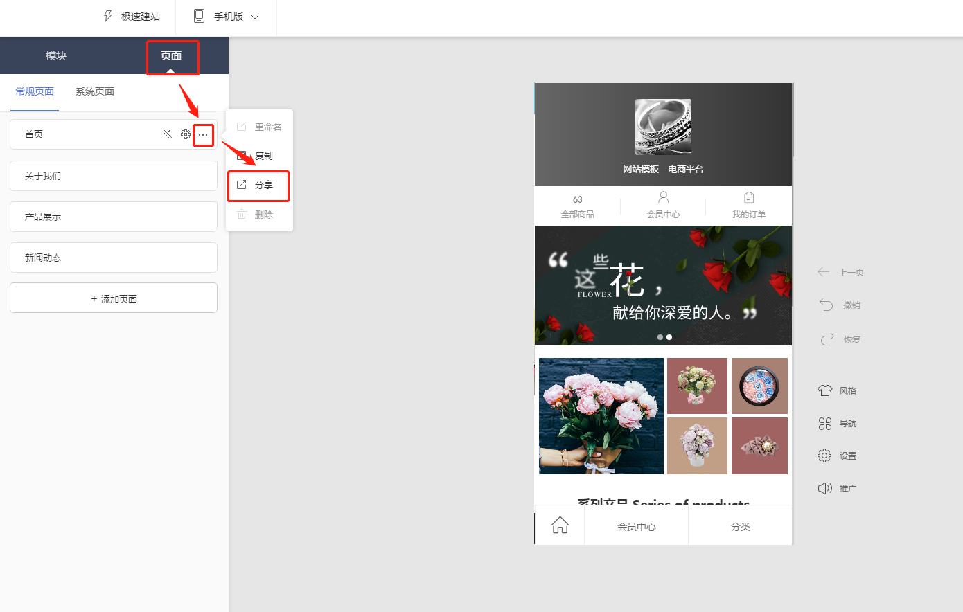 5.1、登录网站后台,在企业中心—点击“前往管理”,进入手机版,在左侧面板中点击“页面”,选择一个你想单独自定义分享信息的页面,点击“分享”按钮。在弹窗内可设置此页面的自定义分享信息。