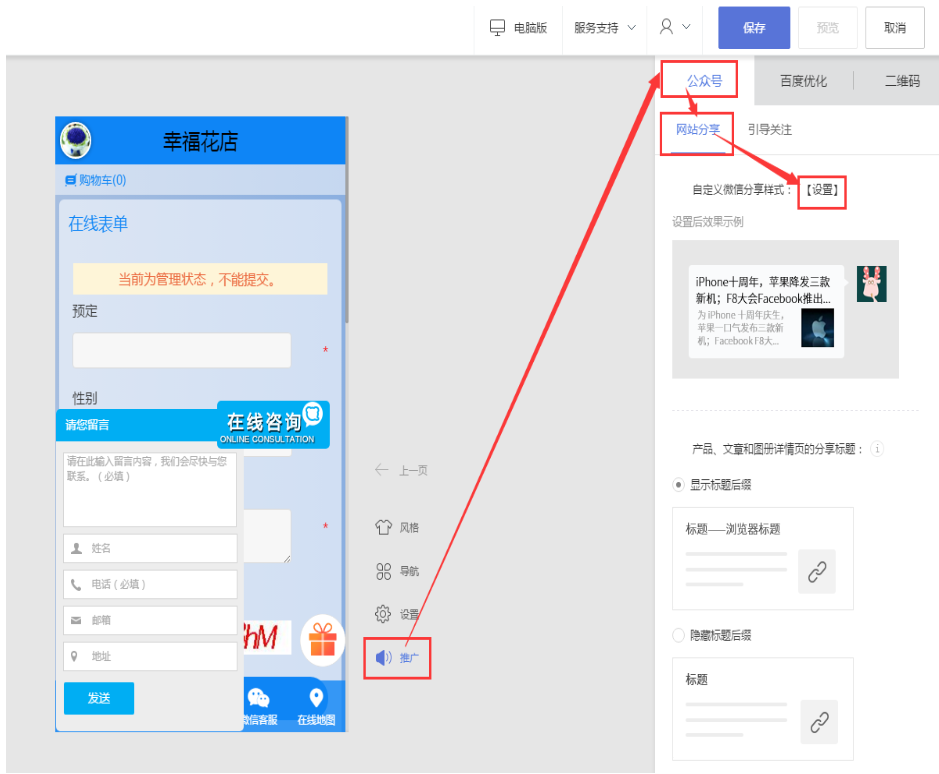4.1、登录网站后台,在企业中心—点击“前往管理”,进入手机版,点击推广—公众号—网站分享—自定义微信分享样式点击设置。