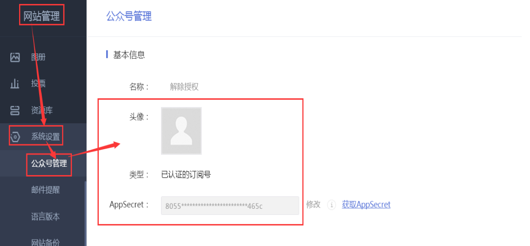 4.3、点击手机版左上角的“网站管理”,在系统设置—公众号管理里授权已认证的公众号,并填写AppSecret。(如何获取AppSecret?请看接下来的步骤4.3.1~4.3.3)
