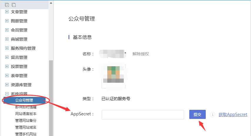 步骤3:复制Appsecret后,回到网站后台-公众号管理进行填写并提交