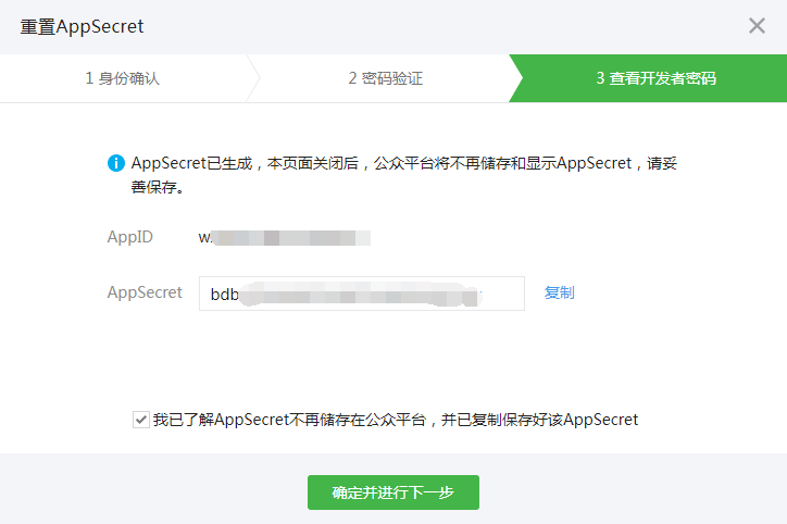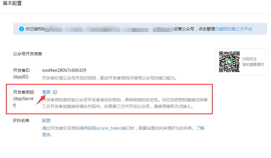 步骤2:如果您未获取过Appsecret或忘记了Appsecret,点击“重置”进行获取