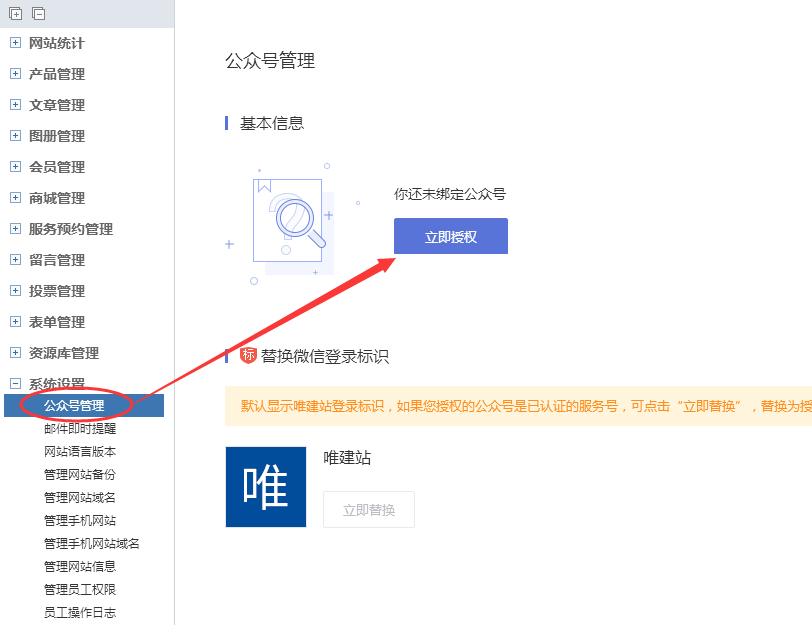 左侧拉到最底,点击“公众号管理”-点击立即授权,授权你的已认证公众号